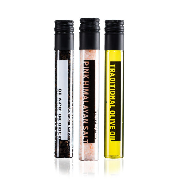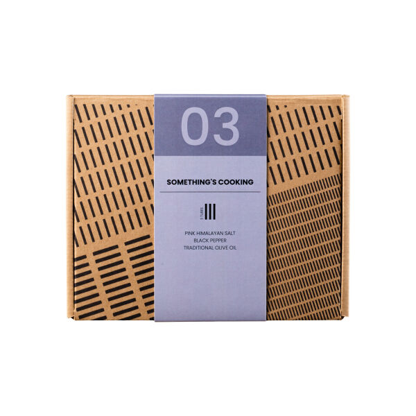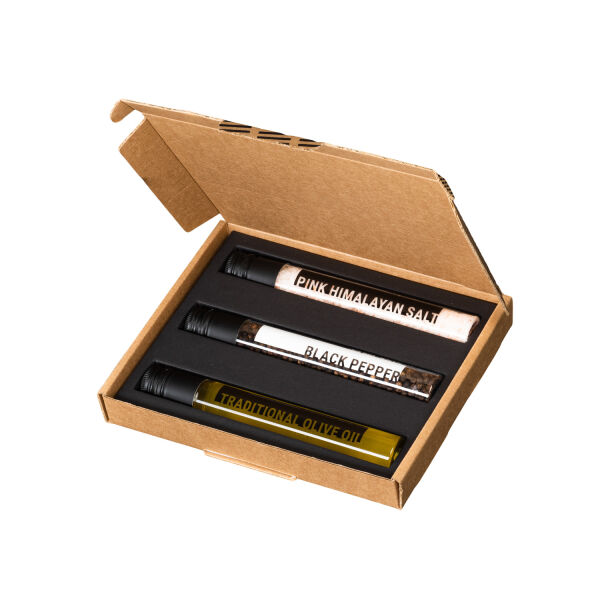 3-Delige kookbox met 3 rPET tubes. Het brievenbusgeschenkpakket bestaat uit Himalaya zout, zwarte peper en traditionele olijfolie. Inhoud: