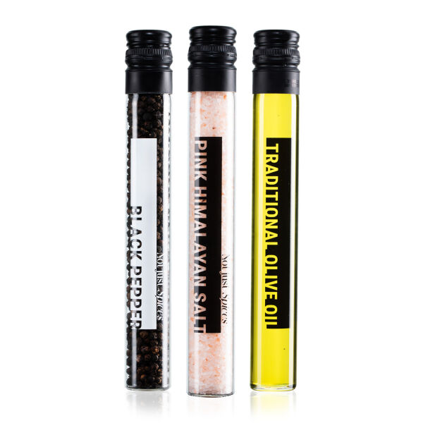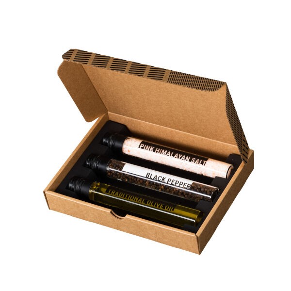 3-Delige kookbox gevuld met 3 glazen tubes met Himalaya zout, zwarte peper en traditionele olijfolie. Inhoud: